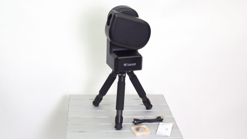 When a new owner opens the SeeStar box, the first item they’ll encounter is a carrying case. Though it’s made of a Styrofoam-like material, it holds up well. Inside is the black, plastic-bodied S50, which looks more like a coffee maker than a telescope. Also in the case is a carbon fiber tabletop tripod. It only raises the telescope 14 inches (355 mm) off the ground, but is usable. Finally, there’s a USB charging cable, a press-in solar filter and a brief instruction pamphlet.